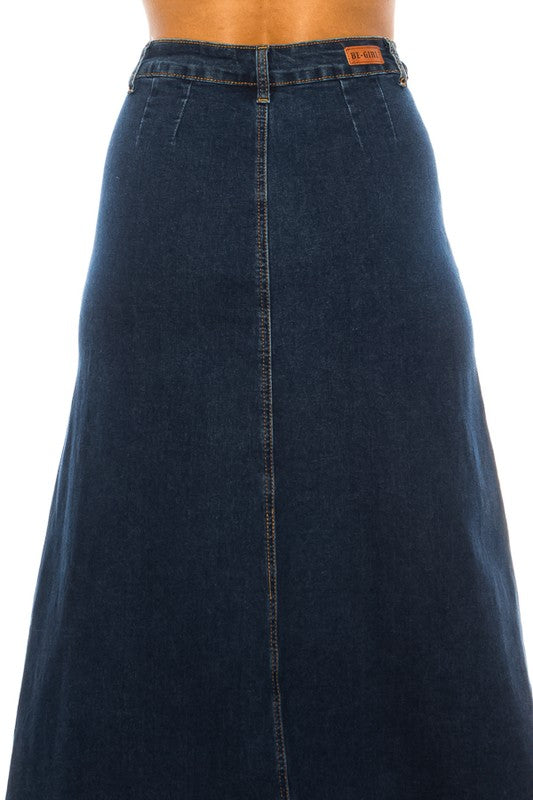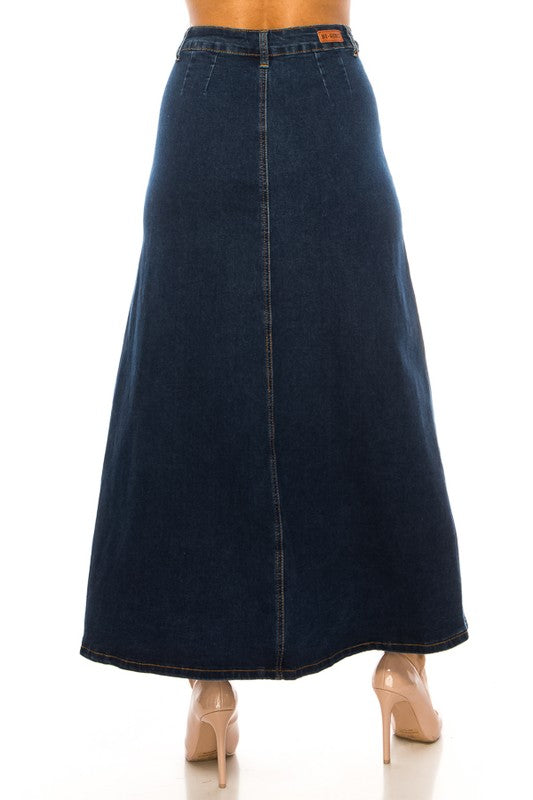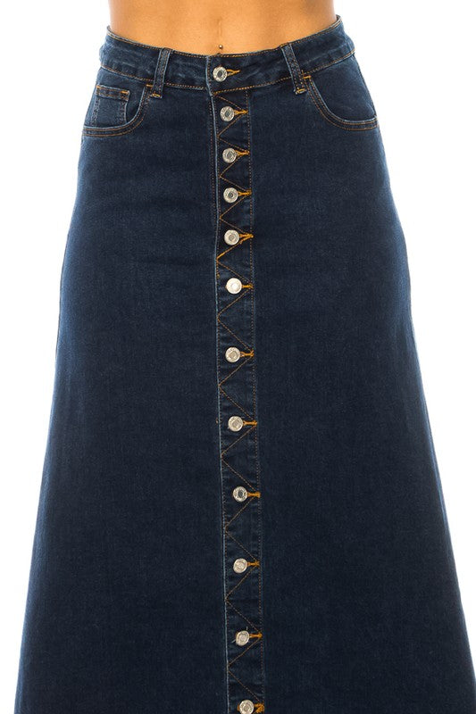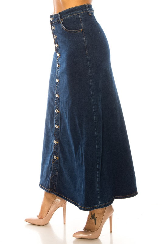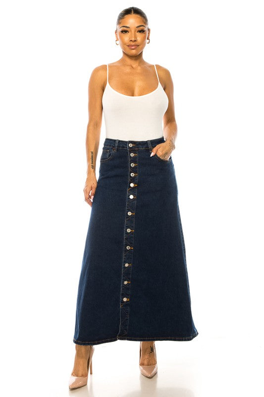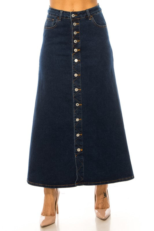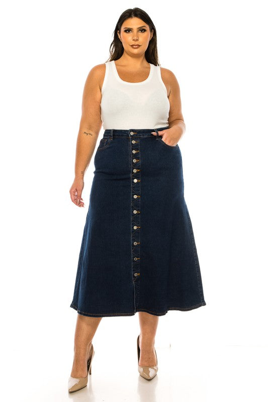 Meet your new favorite skirt with a flare bottom, front pockets and faux buttons for no peak-a-boos and no back slit.