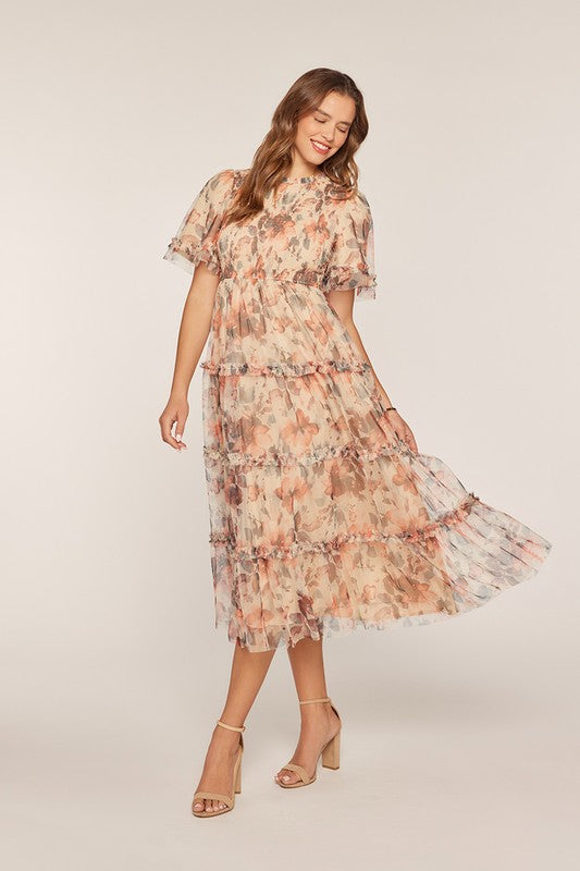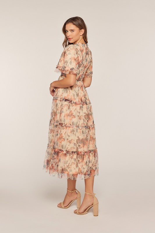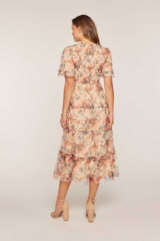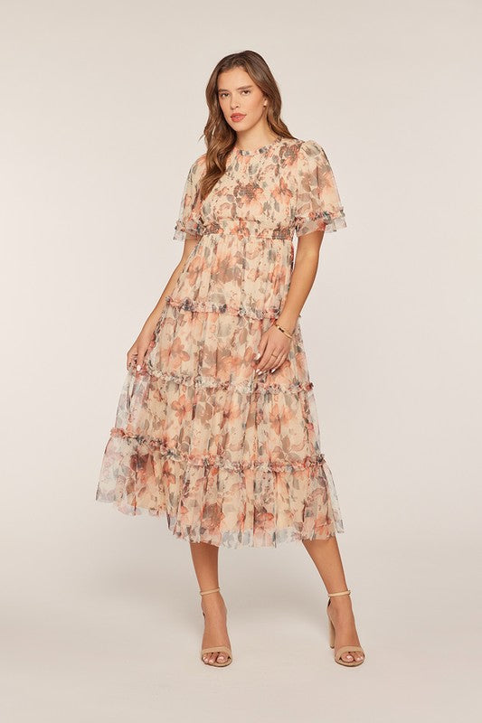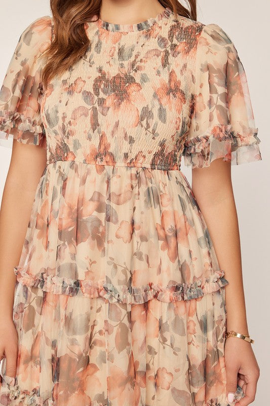 Our Stunning printed mesh smocking dress is the perfect transition dress from summer to fall. Features a lovely round neckline with soft ruffle accents and a back keyhole closure. The short sleeves are made from lined chiffon with delicate ruffle details.
